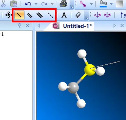 ①选择:选用后点击鼠标左键可以选择单个原子或某个化学键。按住Shift或按住左键拖动可以选择多个原子或化学键。被选中的对象将以黄色显示;