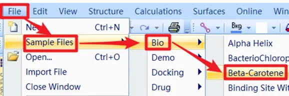 *tips:β-胡萝卜素的简单画法:【File】——【Sample Files】——【Bio】中选择Beta-Carotene,可即时生成β-胡萝卜素分子的2D和3D分子图像。