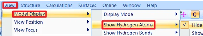方法二:框选3D立体模型后,通过【Model Display】——【Show Hydrogen Atoms】——【Hide】,同样可以达到隐藏氢原子的目的。
