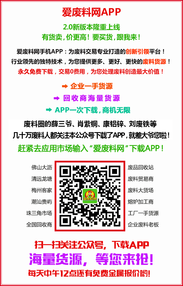 打造国内金属废料价格数据新标准!下载爱废料网APP,每天免费看更多报价,找更多货源!