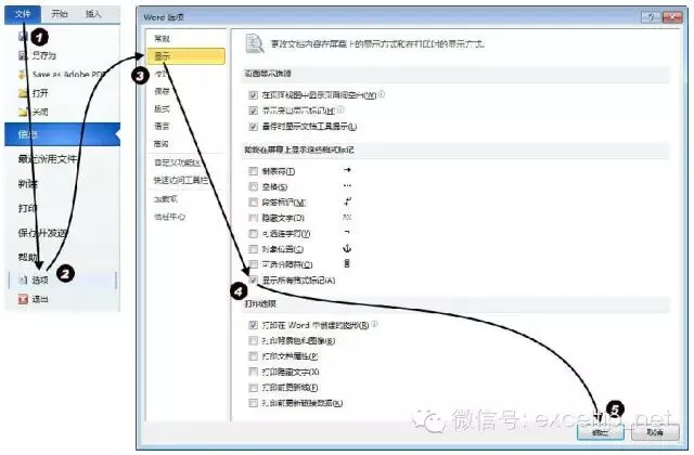 方法3 如图 2‑28所示,单击“开始”选项卡→“选项”命令,弹出“Word选项”对话框→“显示”选项页,在“始终在屏幕上显示这些格式标记”区域勾选“显示所有格式标记(A)”选项→“确定”按钮。
