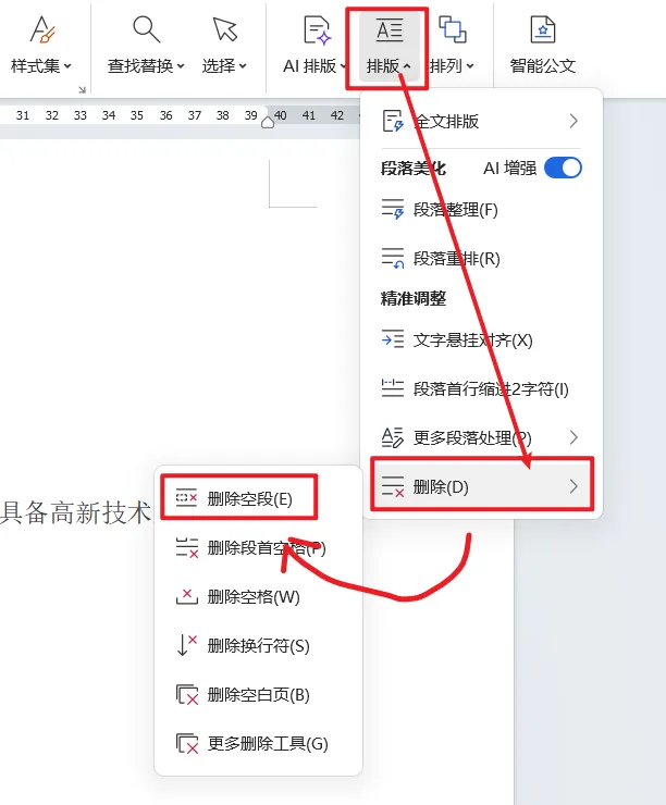 2. 利用WPS排版功能批量删除空行 • 选择【排版】–【删除】–【删除空段】,一键清除所有多余空行。