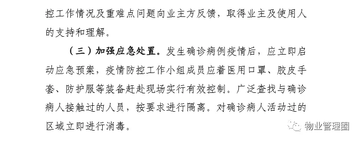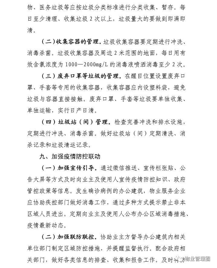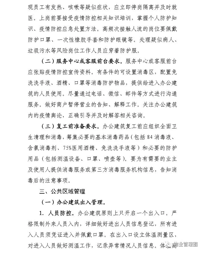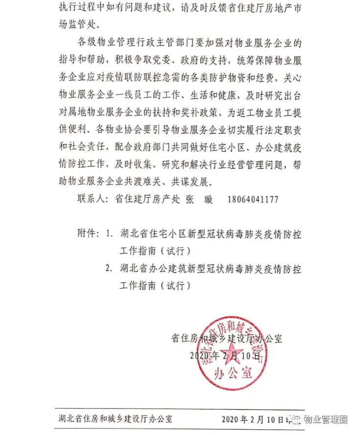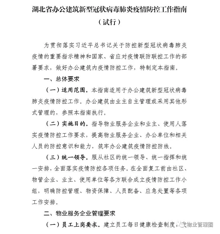 下载电子版|小区、办公楼新冠肺炎疫情防控工作指南(湖北版) 附件一: 附件二: 如需全文,请留邮箱~ 统稿:晓 乐 编排:子 薇 版权归原作者所有,如侵权,请告知,我们及时删除或妥当处理,谢谢! ▶物业客户满意度提升方案+计划表,免费领! ▶中物协发布住宅物业防控新冠肺炎操作指引 ▶新冠肺炎防控物业培训方案、消杀流程指引、台账表 ▶购买了停车位,物业还收取车位管理费, 合理吗? ▶客服部工作总结暨工作计划,赶快收藏~ 点一下你会更好看耶