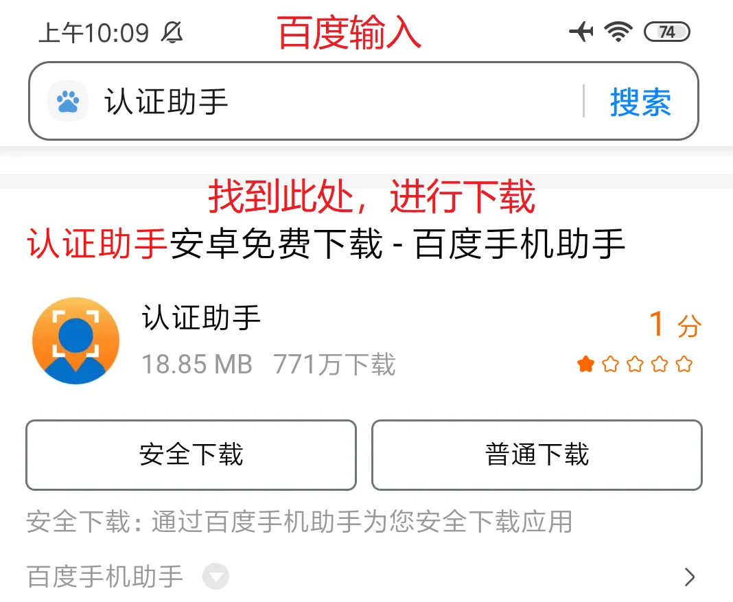 方法一:在手机浏览器中,打开百度,搜索“认证助手”下载。