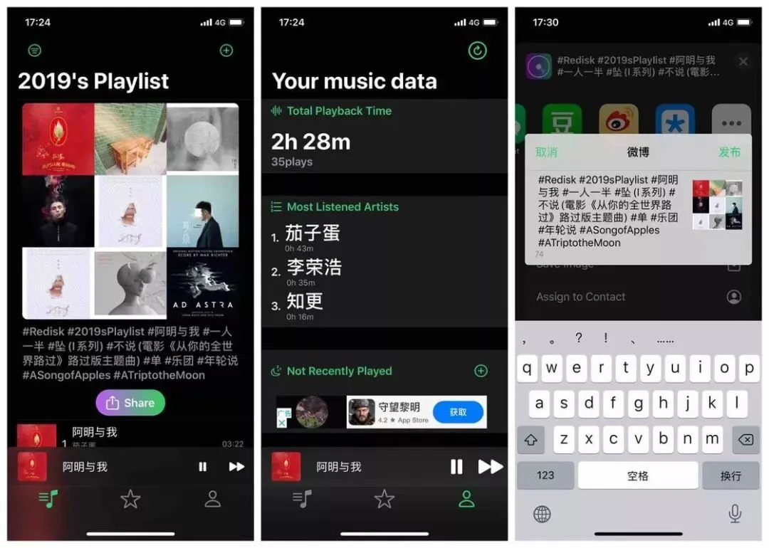 年末,又到了各类应用推出年终总结报告的时候,Apple Music 也在前一段时间推出了年度总结;不过,Apple Music 用户只能获得年度歌单、常听的歌手和专辑,想要查看更多数据就没有办法了。有了 Redisk 这款应用,或许会让你的 Apple Music 年度总结稍微丰富一些。首先,Redisk 会根据你的资料库内容自动生成 2019 年度播放榜单,点击右上角的「+」,你可以将这一播放列表加入到 Apple Music 资料库中。此外,你还可以将榜单和封面分享到社交网站上,与好友分享你的音乐品味。一份歌单未免太单薄,Redisk 还能让你了解自己在 Apple Music 上聆听了多少时间、最爱的歌手 / 艺术家是谁,以及最近被你抛在脑后的一些歌曲作品等,颇有一款 Apple Music 年度总结工具的意思。除了上述功能外,Redisk 也是一款简单的音乐播放器。你可以直接用 Redisk 播放你的年度音乐,不过应用仅支持播放 / 暂停和下一首功能,要作为主力第三方播放器就有些「寒碜」了。 你可以在 App Store 上免费下载 Redisk。