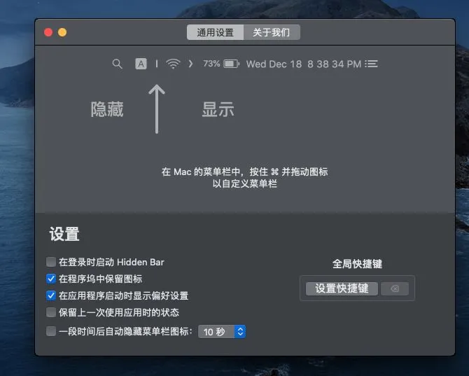 相比 Windows 状态栏可以手动隐藏不常用的图标,Mac 一直以来都没有相关的原生工具,以往都需要借助例如 Bartende 这样的第三方工具,而 Hidden Bar 也是类似的一款工具,当然相比 Bartende 主要专注于隐藏图标这一项功能。运行之后在菜单栏就会出现一个「|」分隔符,分隔符左侧是需要隐藏的图标,而右侧则是需要显示,按住 ⌘ 拖动图标到分割符两侧来实现是否隐藏或者显示。然后点击菜单栏右侧的小箭头来实现隐藏。 关注少数派(ID:sspaime),在后台回复「App」即可获得下载链接。Hidden Bar 支持设置全局快捷键来展开或者隐藏菜单,还可以设置多少秒之后自动隐藏图标。你可以在 Mac App Store 免费下载 Hidden Bar,或者在 GitHub 获取 Hidden Bar 的源代码。