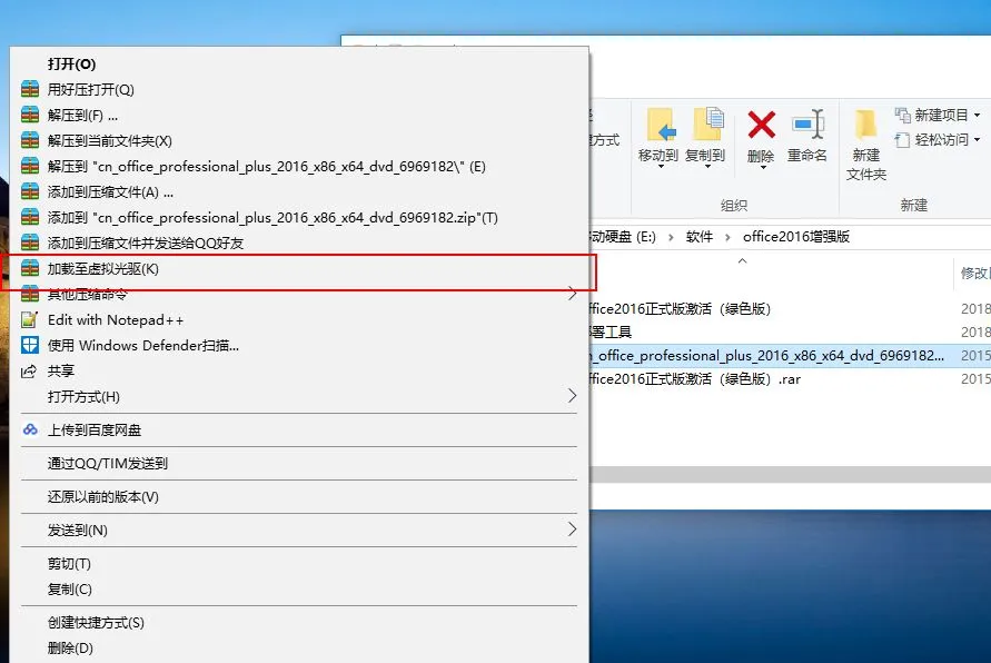 安装好压之后,鼠标右击下载的office2016,在弹出的菜单中点击加载至虚拟光驱。加载到虚拟光驱后,打开我的电脑,会看到有一个叫CD驱动器的盘,图标是office的LOGO,不要打开否则会直接安装所有office套件。