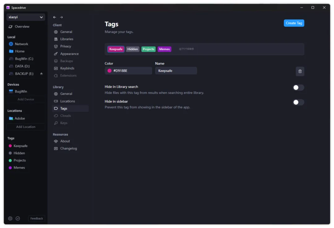 另外还支持了标签 Tags 功能,你可以通过自定义新增标签和设置颜色,方便用来给文件分配标签。