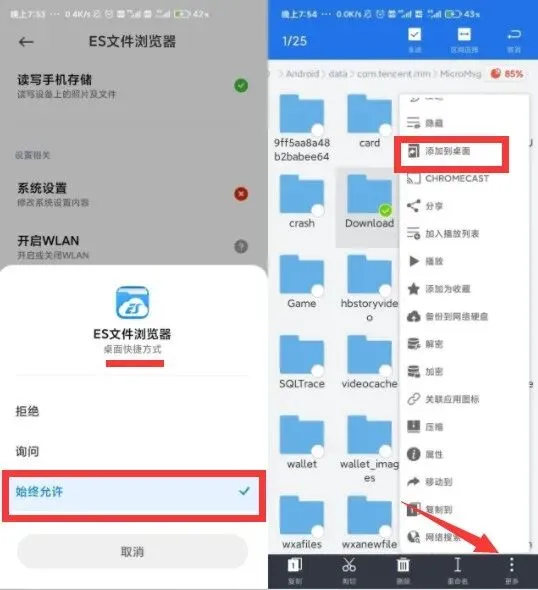 这里就再给大家介绍一下,首先需要打开 ES 文件管理器的桌面快捷方式权限,然后找到需要建立快捷方式的文件夹,长按后选择更多—添加到桌面。