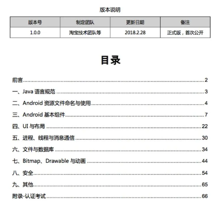本手册以开发者为中心视角分为Java语言规范(遵循《阿里巴巴Java开发手册》),Android资源文件命名与使用,Android基本组件,UI与布局,进程、线程与消息通信,文件与数据库,Bitmap、Drawable与动画,安全以及其他等九大部分。