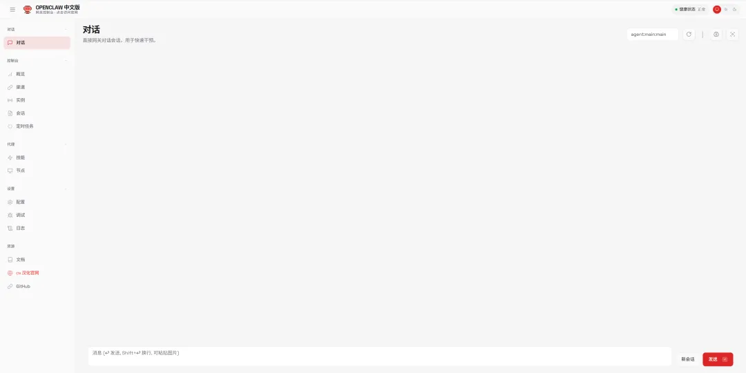 先来看看OpenClaw的中文界面长什么样,汉化后的操作非常友好: