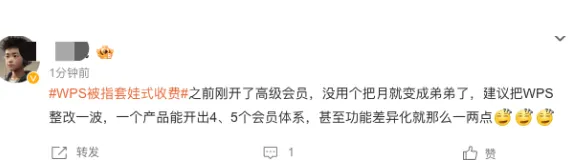 「之前刚开了高级会员,没用个把月就变成弟弟了,建议把WPS整改一波,一个产品能开出4、5个会员体系,甚至功能差异化就那么一两点」