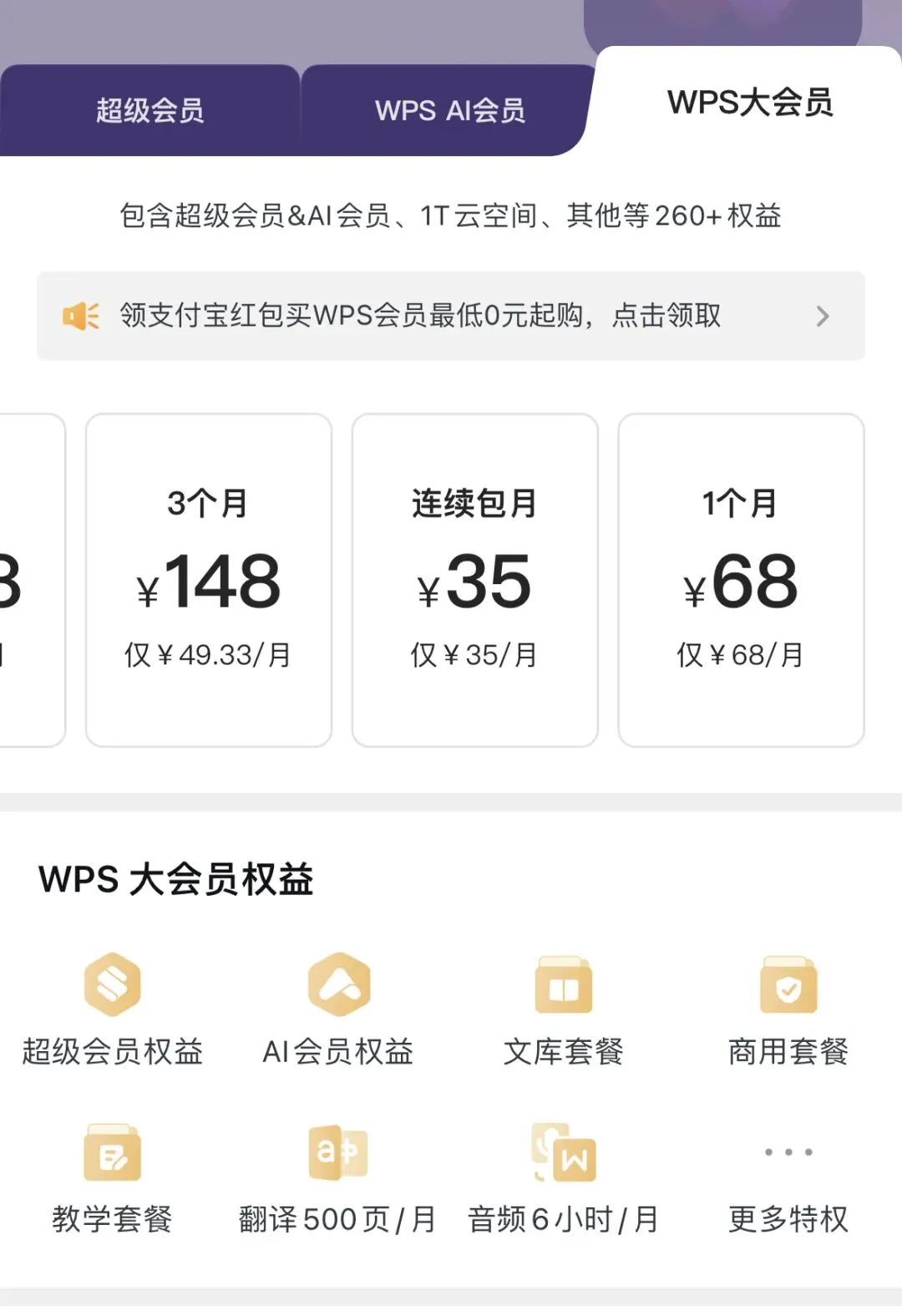 你以为这就完了吗?在相同会员的不同套餐下面,还有小套餐,比如如编辑PDF的「PDF套餐」、云文档多设备同步的「云盘套餐」。