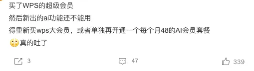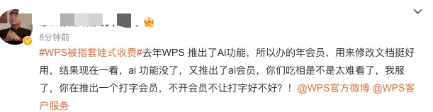 「去年WPS 推出了Ai功能,所以办的年会员,用来修改文档挺好用,结果现在一看,ai 功能没了,又推出了ai会员,你们吃相是不是太难看了,我服了」