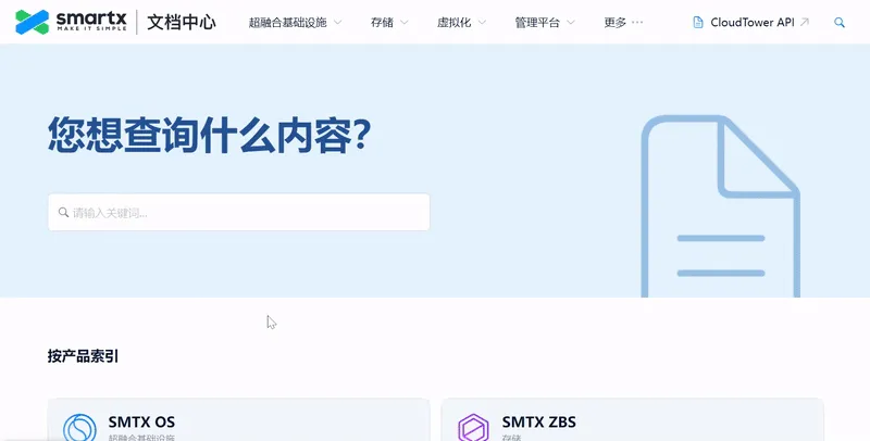 如果您是开发者,可以直接访问 https://code.smartx.com 查阅 API、SDK 文档,也可以通过文档中心导航栏右上角的“CloudTower API”进行跳转。
