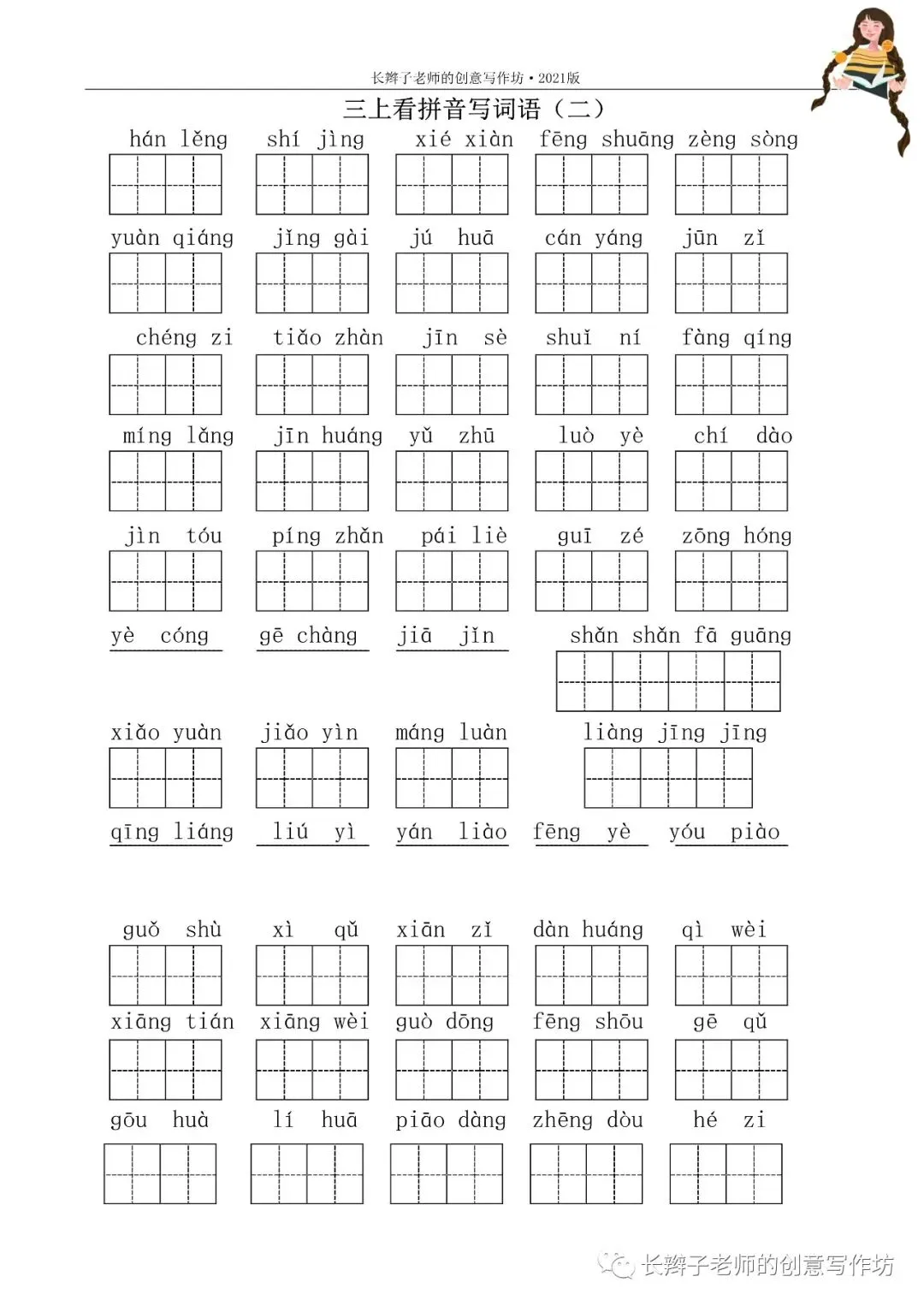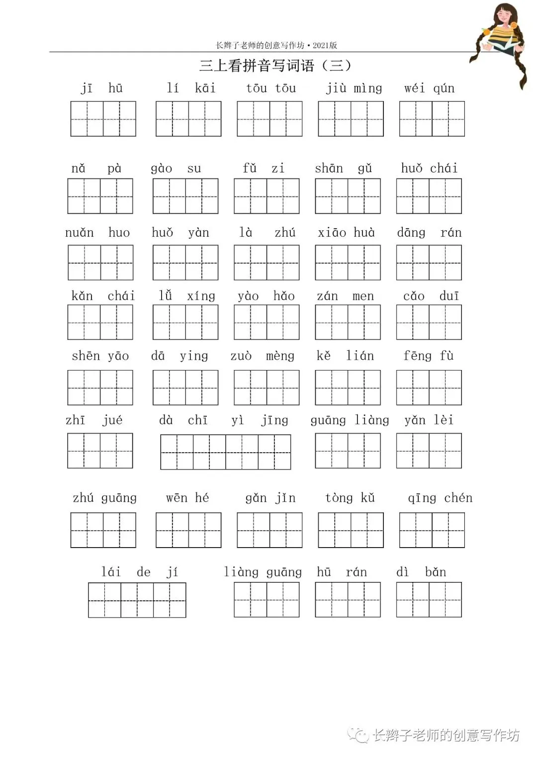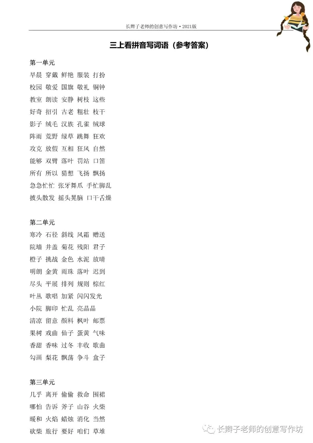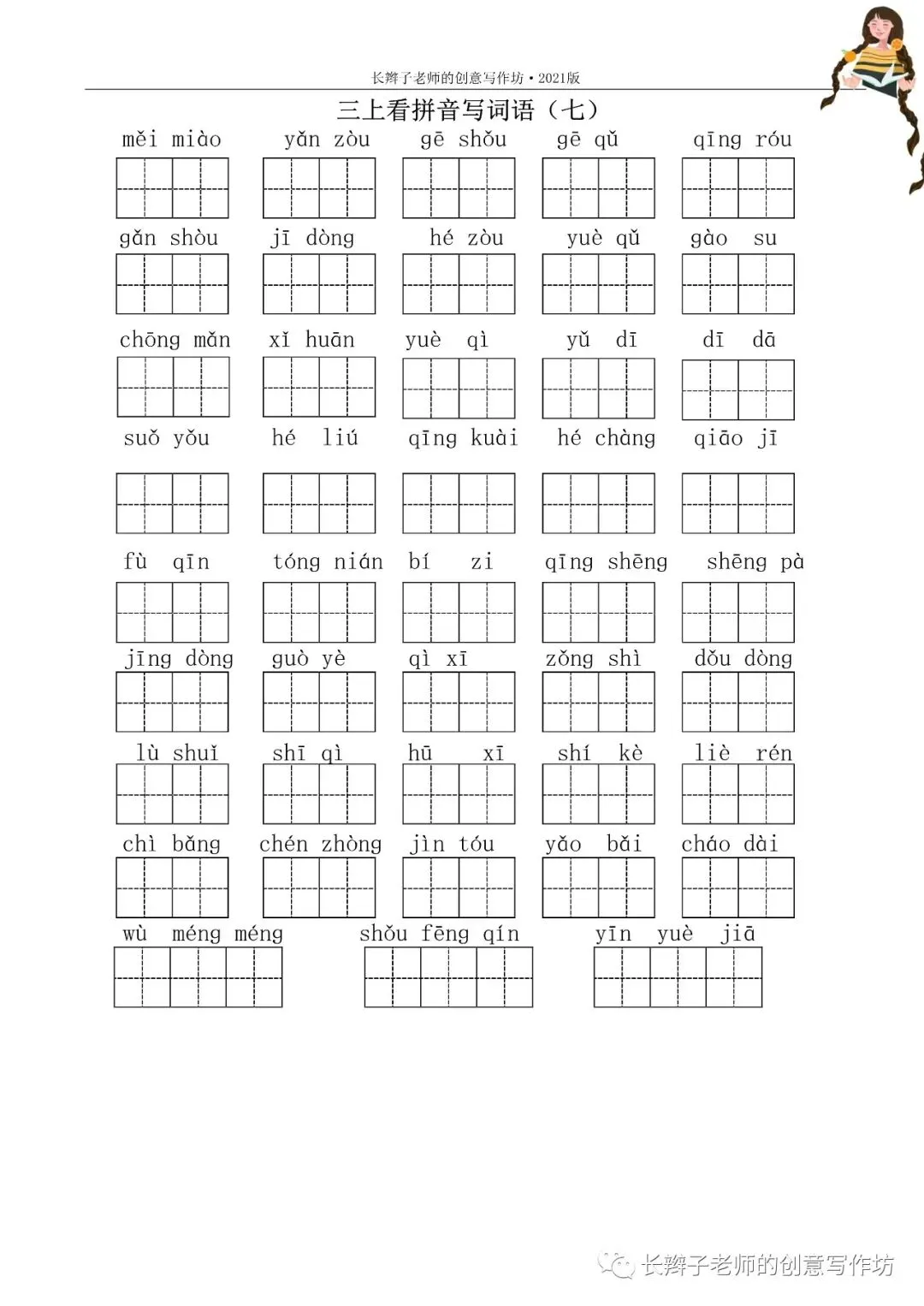 三上词语测试卷(word下载) 三上词语测试卷 文|郭学萍 前言 若需要《三上词语测试卷》,请关注微信公众号“长辫子老师的创意写作坊”,在首页留言区写——三上词语测试卷,便会自动弹出提取链接。 自主练习卷 参考答案