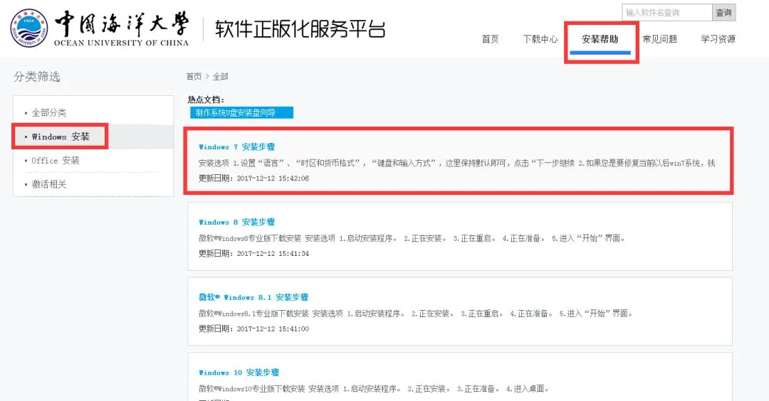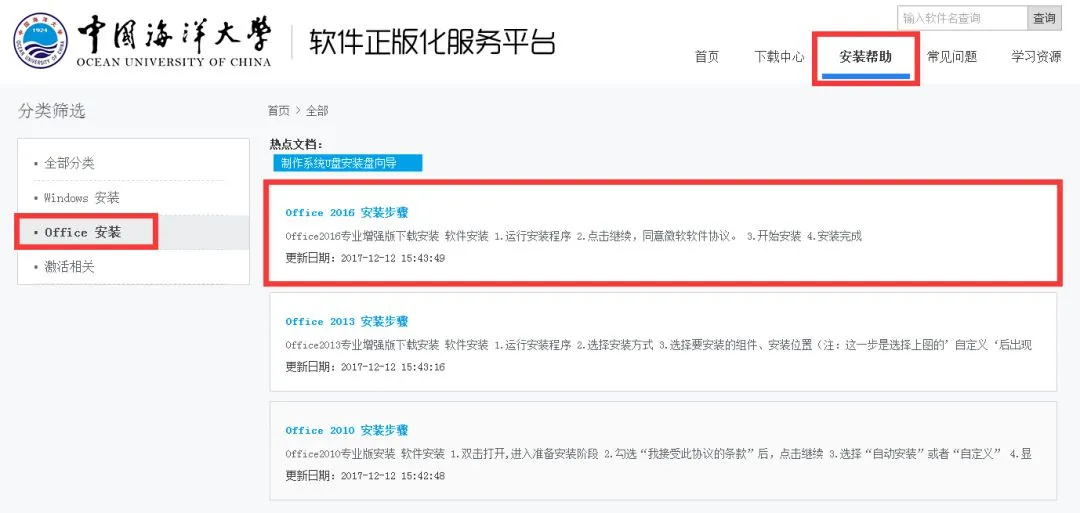 ②点击首页“安装帮助”了解相应windows操作系统和office办公软件的具体安装步骤