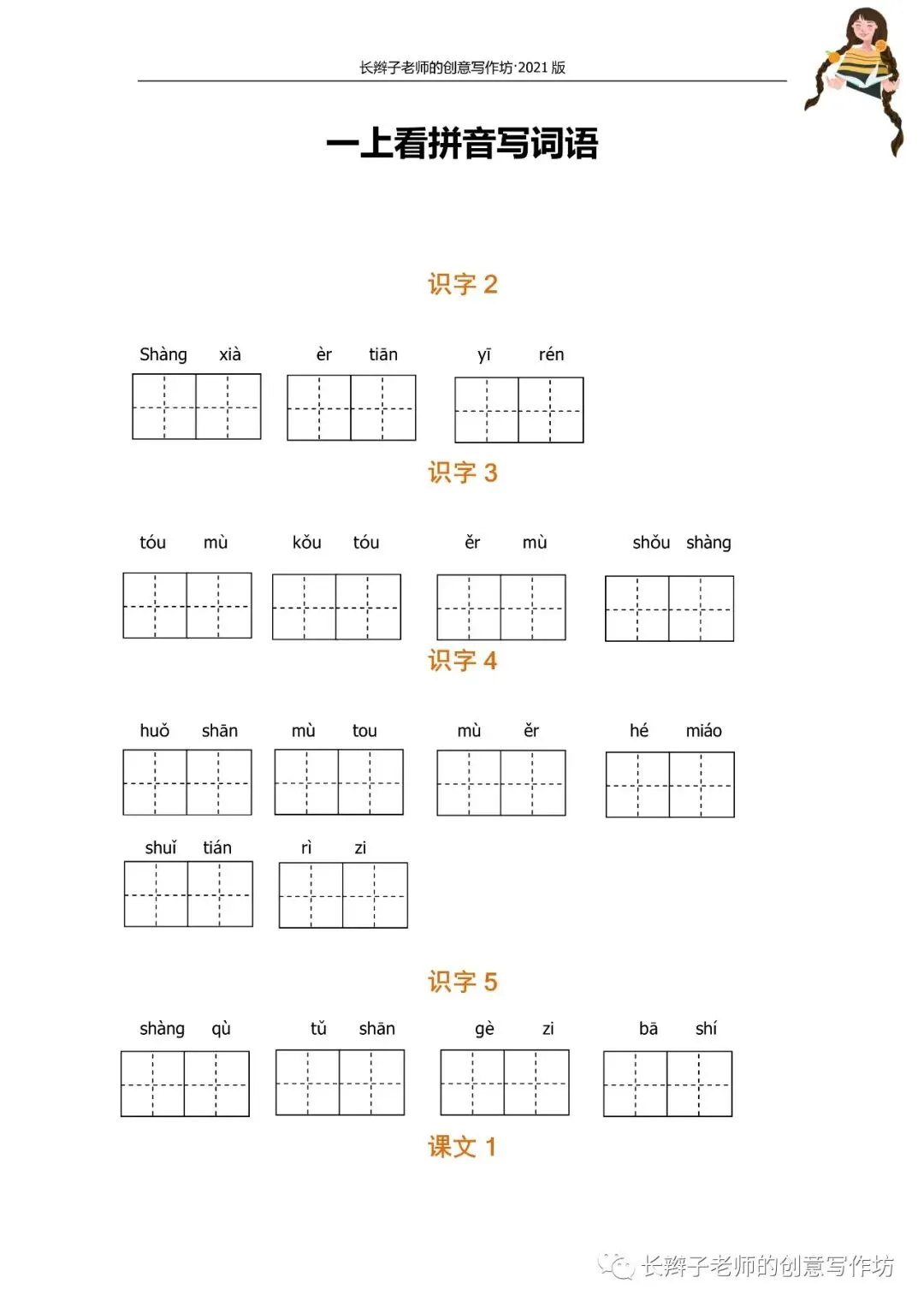 一上:看拼音写词语(word下载) 一上:看拼音写词语 文|郭学萍 前言 若需要《一上:看拼音写词语》,请关注微信公众号“长辫子老师的创意写作坊”,在首页留言区写——一上看拼音写词语,便会自动弹出提取链接。 自主练习卷 参考答案