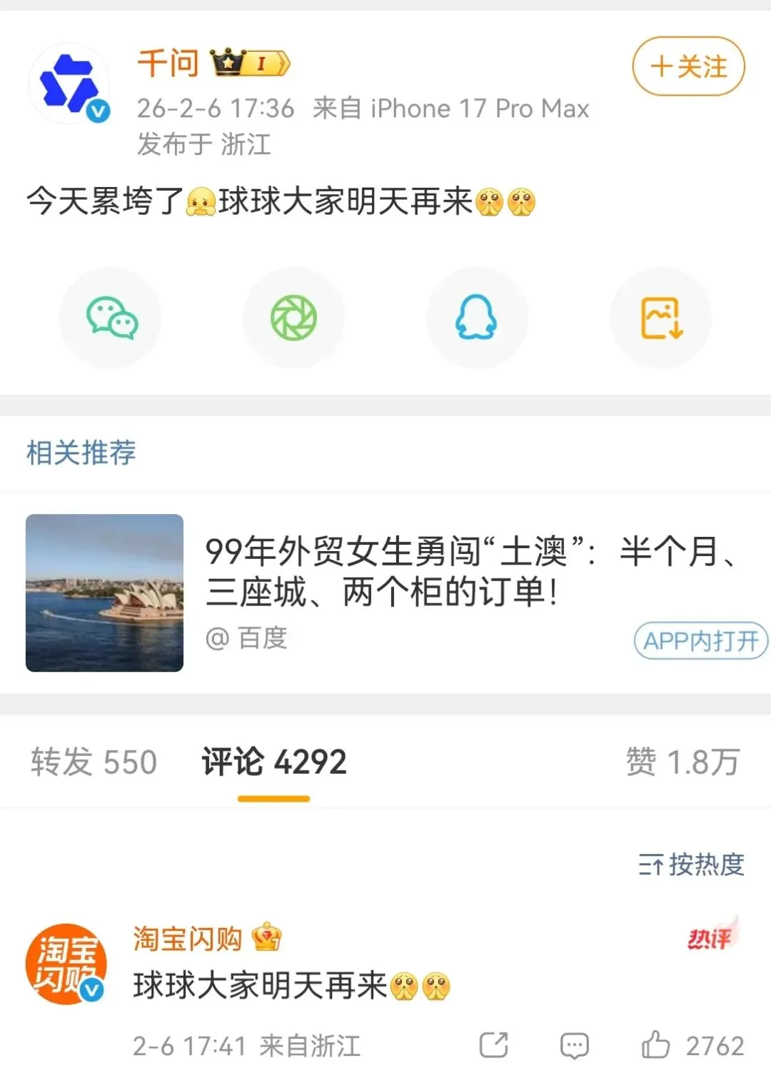 2月6日下午16:46分千问破1000万单,千问也是发了感恩信于微博,“感恩大家,一起创造全球AI购物的历史。”