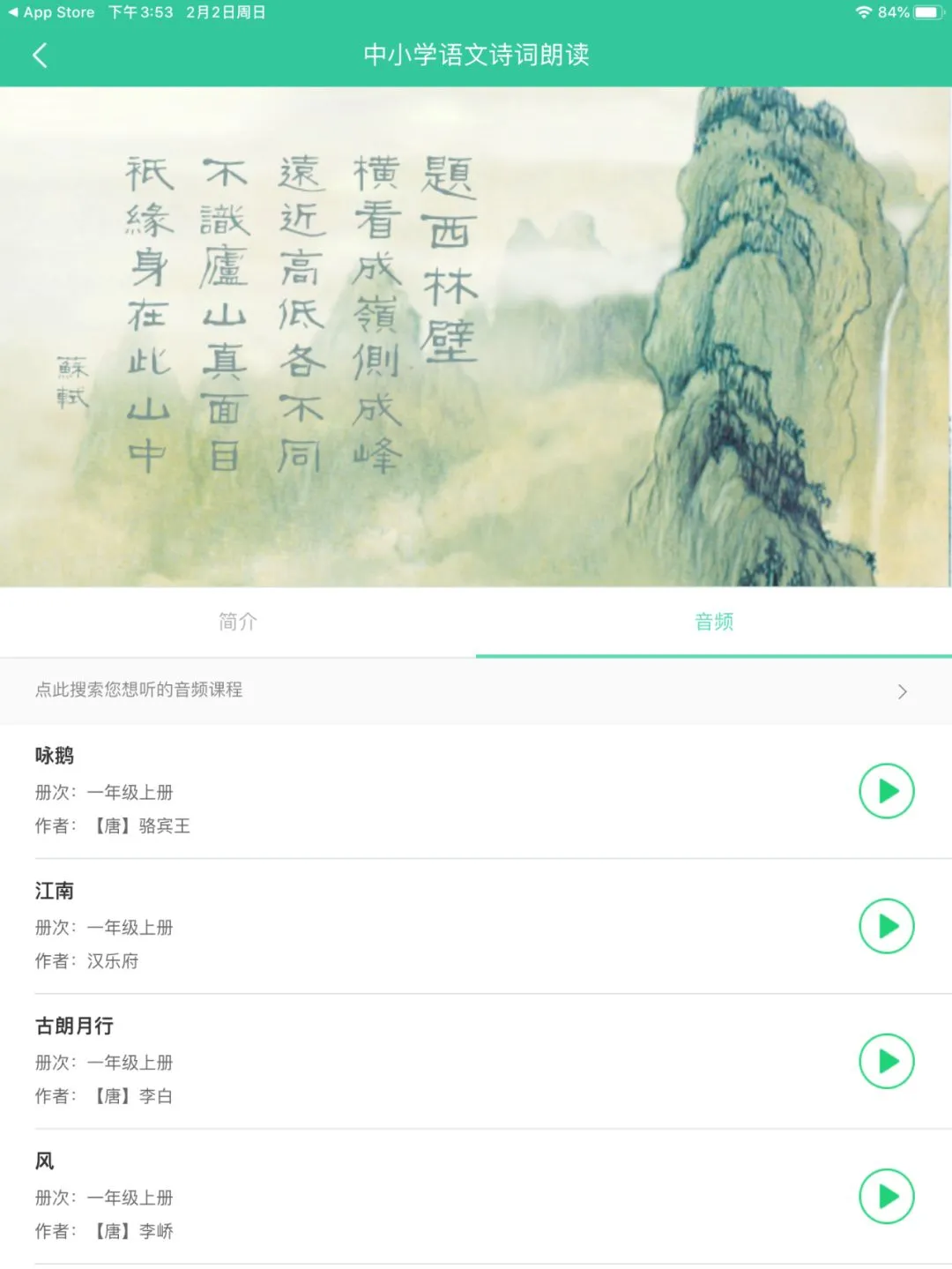 还专门有个中小学语文诗词朗读的部分,每首都注明了是出现在几年级的教材中,而且还有音频。
