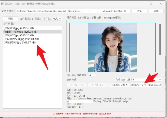 输入路径后,就能直接查看VX保存的图片了;遇到没用的图片,勾选后点击【删除选中文件】就能清理。