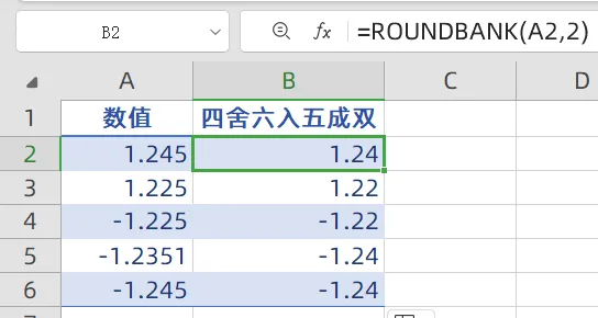 ROUNDBANK函数 用四舍六入五成双规则舍入数字;