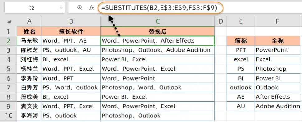 SUBSTITUTES函数:将字符串中的多个字符批量替换为新字符;