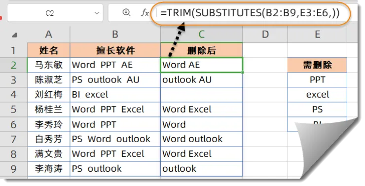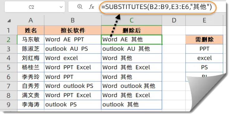 四、SUBSTITUTES函数支持动态溢出,如下图所示,使用以下公式可以根据右侧的对照表,将B列单元格中包含的关键字全部删除。