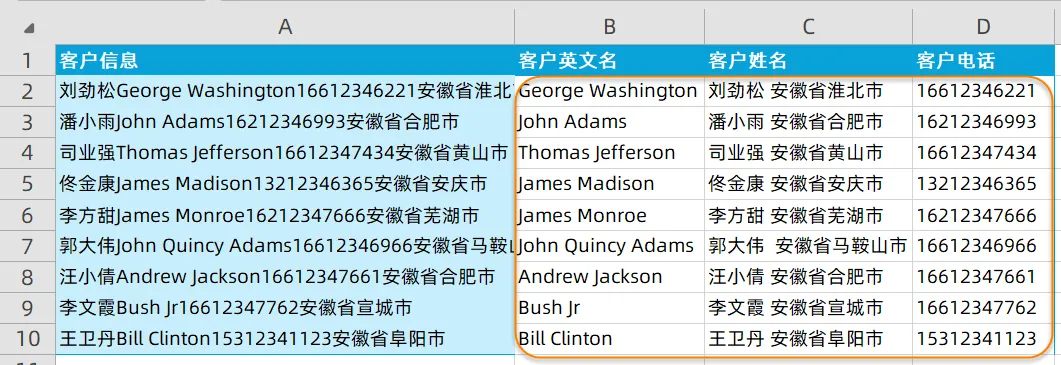 六、如下图,希望从A列的混合内容中,分别提取出英文,中文和电话号码。