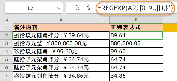 七、如下图,希望提取A列混合内容中的金额数字,也可以在B2单元格使用以下公式,下拉即可。