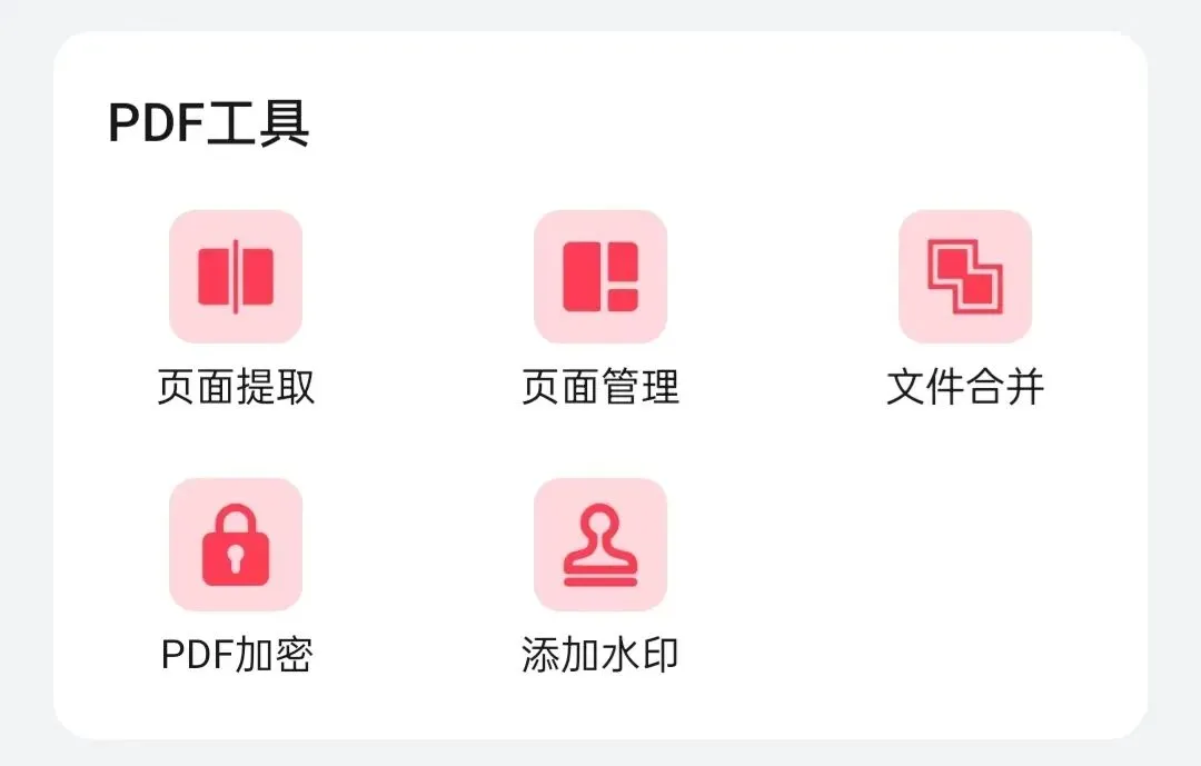 全文件管理器:PDF工具 PDF工具模块入口位于App(#全文件管理器)主页面-工具箱tab页内,包含功能如下: 页面提取 可把pdf文件内的单个页面提取为图片、多个页面合并为长图或把多个页面提取为一个新的pdf文件。 页面管理 可删除pdf文件内的指定页面;可把不同pdf文件内的页面组合成一个新的pdf文件。 文件合并 可把多个pdf文件按顺序合并为一个新的pdf文件。 PDF加密 可对pdf文件进行加密,打开需要输入密码。 添加水印 可对pdf页面添加水印,可自定义水印的字体颜色和大小。