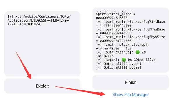 操作方法很简单,关闭WiFi,等待30秒,再点击 Exploit 按钮,然后点击“show File Manager”选项即可进入VAR目录。