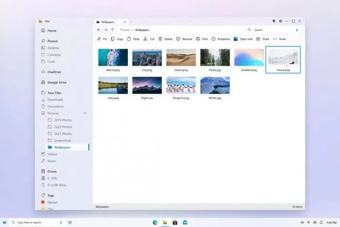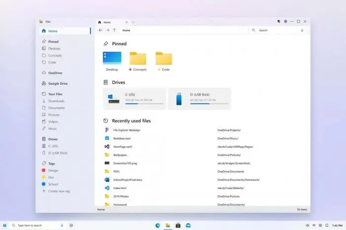 在放出的两张概念图中,第一张展示了一个时尚的文件资源管理器,采用了 Fluent Design 设计,保持了简约的外观。关键点包括微软新图标的使用,以及左侧窗格中的标签。可以看到,这可以用来标记和颜色编码你的文件和文件夹,使它们更容易被发现。