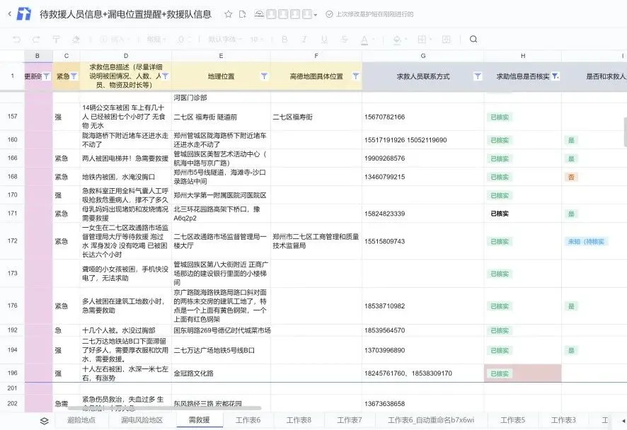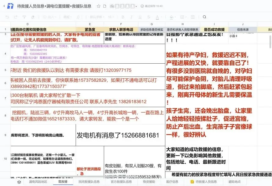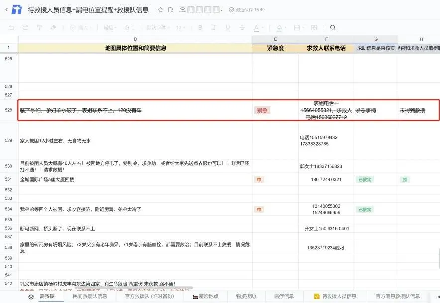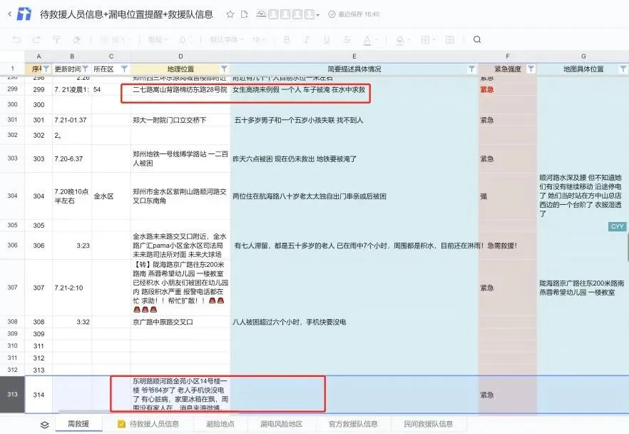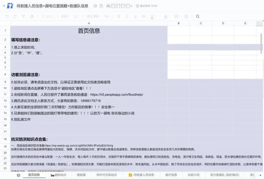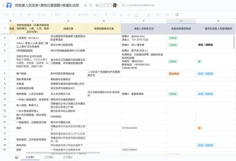 在刷屏的队伍里,有一个文档很特别,命名为 ———《待救援人员信息》,这是民间救援组织在腾讯文档上进行救援信息收集的在线表格。