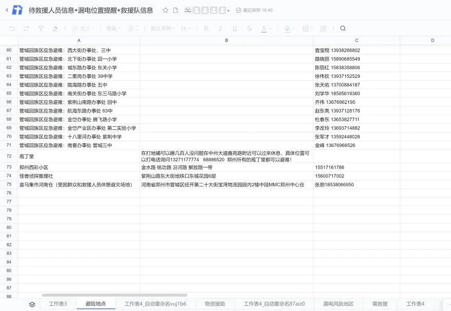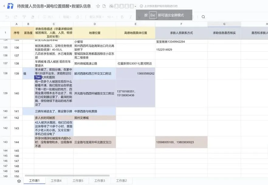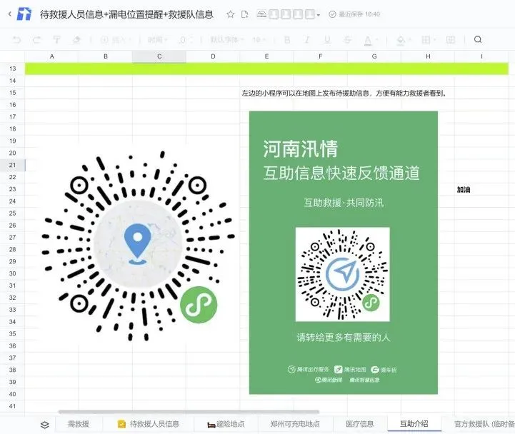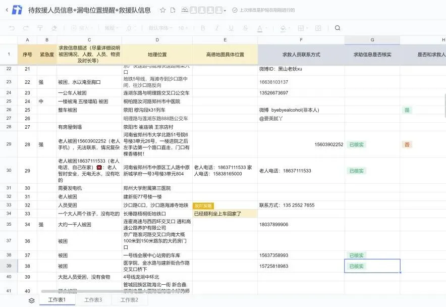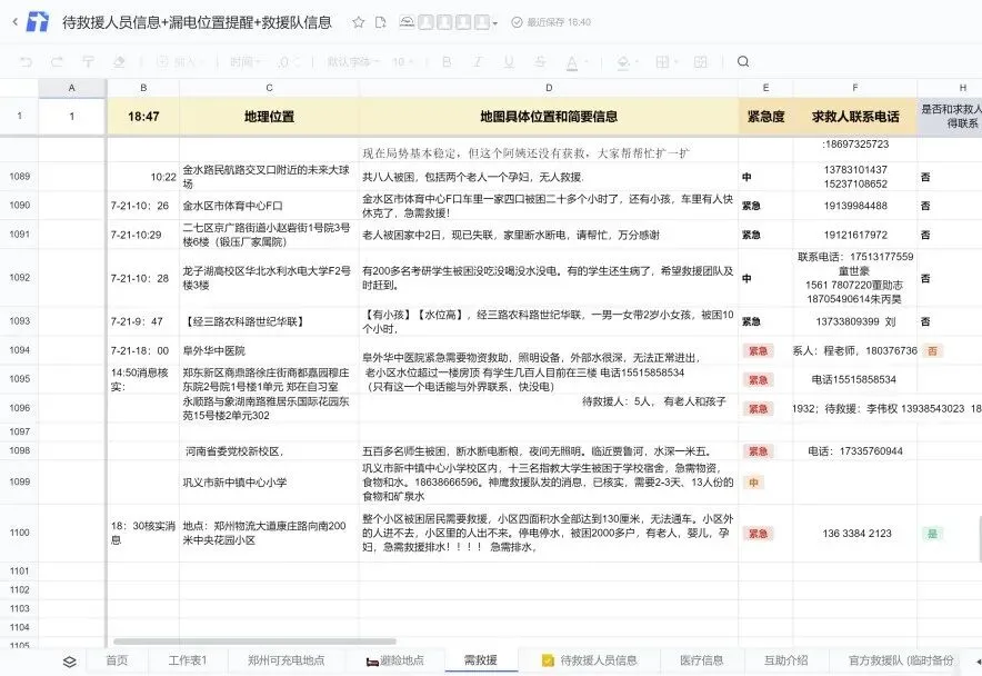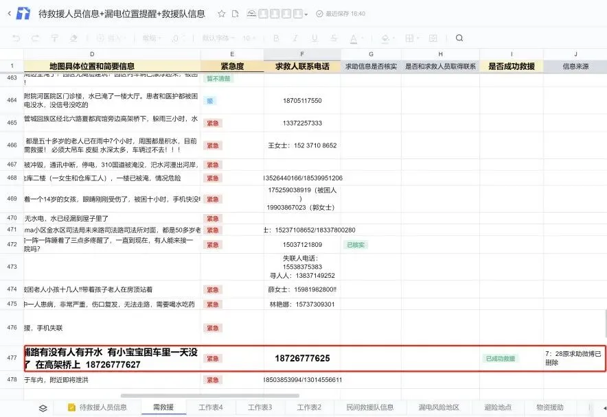在刷屏的队伍里,有一个文档很特别,命名为 ———《待救援人员信息》,这是民间救援组织在腾讯文档上进行救援信息收集的在线表格。