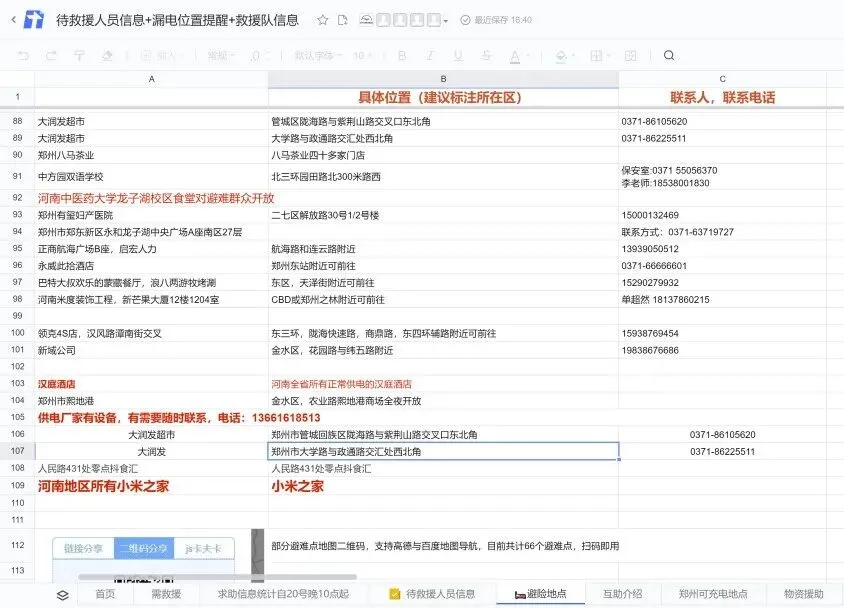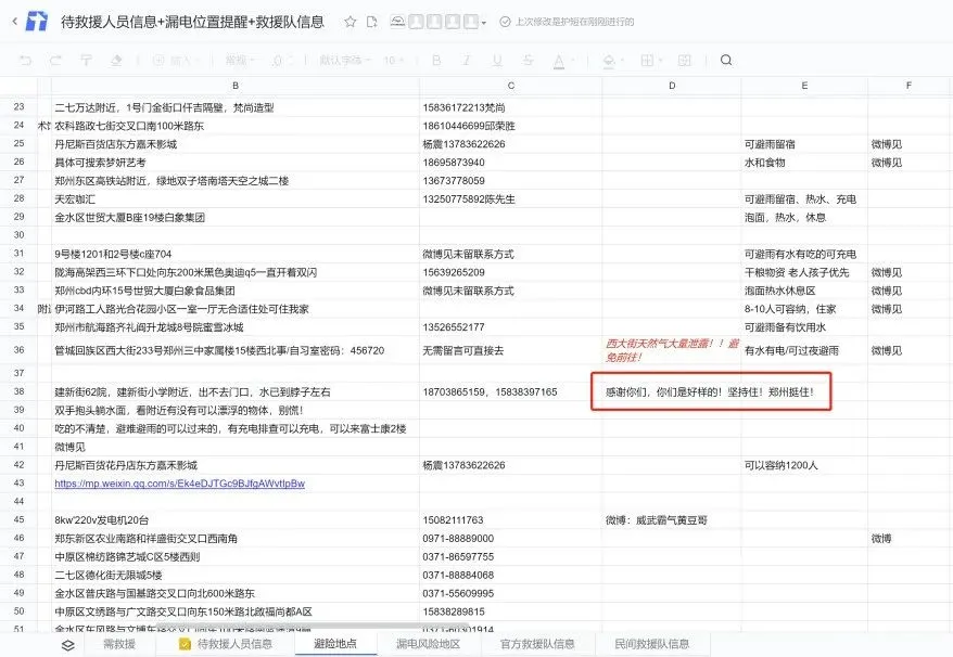 个人和商户自发提供的避险地点也超过50个,有用户留言:“感谢你们!你们是好样的!坚持住!郑州挺住!”