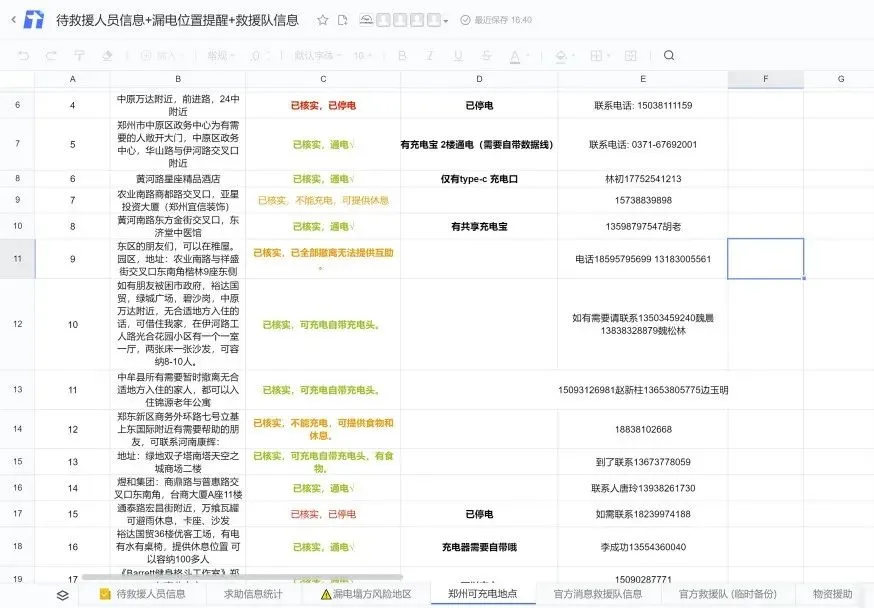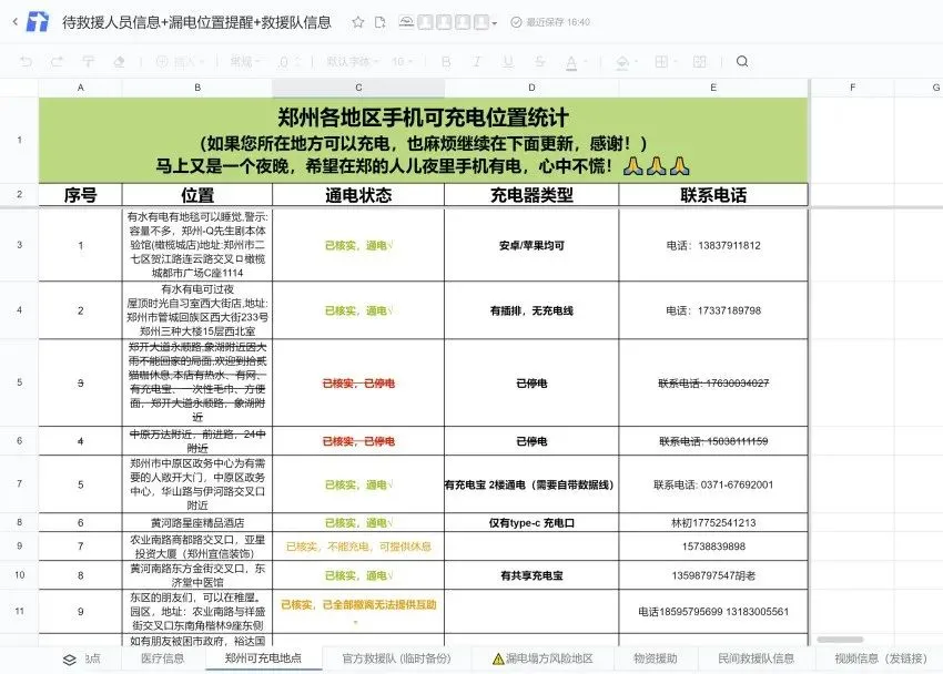 可充电地点表格的首行多了一句话:“马上又是一个夜晚,希望在郑的人儿夜里手机有电,心中不慌!”