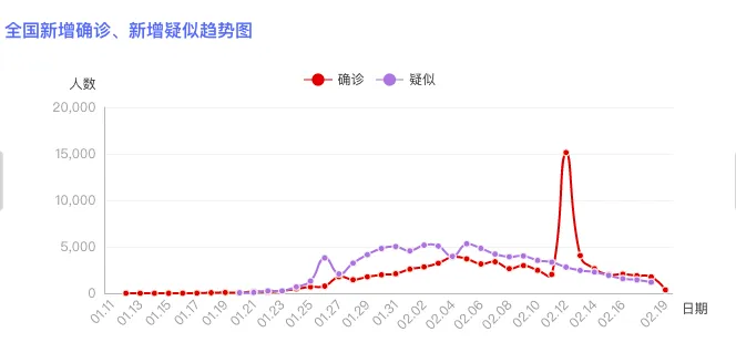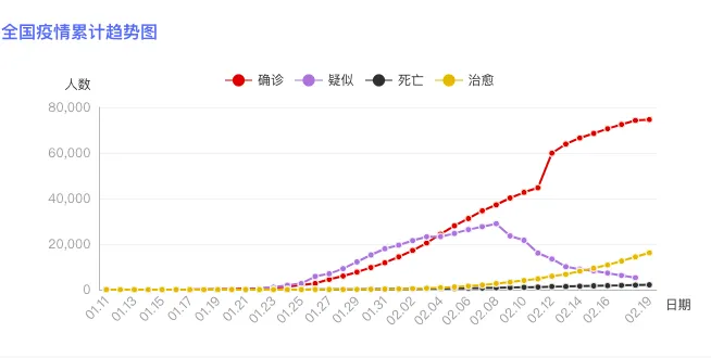 截至 2 月 20 日 8 时,国家卫健委收到来自全国累计报告确诊病例 74653 例(较昨日新增 374 例),累计疑似病例 5248 例(较昨日新增 1185 例),累计死亡病例 2118 例(较昨日新增 112 例),累计治愈病例 16154 例(较昨日新增 1767 例)。