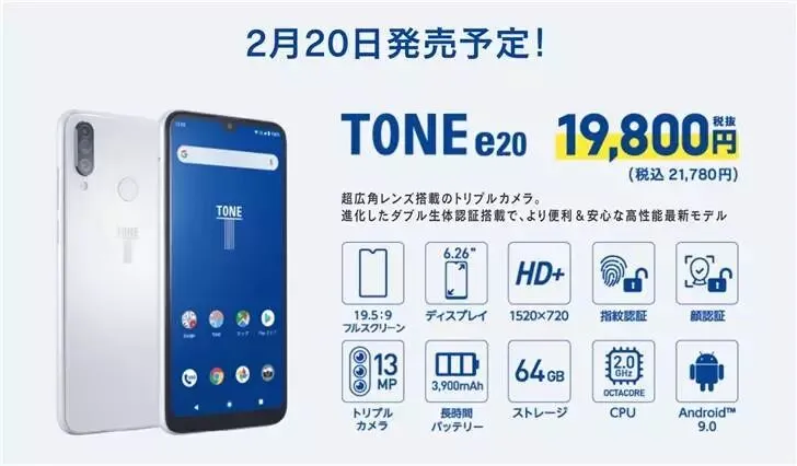 但该手机配置不高,6.26 英寸显示屏,搭载联发科 Helio P22 芯片组和 4GB 内存 + 64GB 存储空间,后置三摄 1300 万像素 + 1200 万像素 + 200 万像素,前置 800 万像素,售价为 19800 日元(约合人民币 1260 元),仅日本有售。