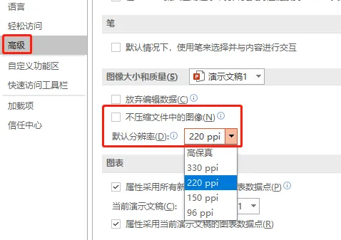 大家可以依次点击「文件」→ 「选项」→ 「高级」→ 「图像大小和质量」。在默认情况下,软件会自动压缩图片,且默认分辨率较低。