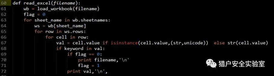 读取Excel内容需要用到的库是openpyxl。查找关键字的思路是将每一个单元格读出来和keyword比较,如果包含keyword则打印文件路径和单元格内容。