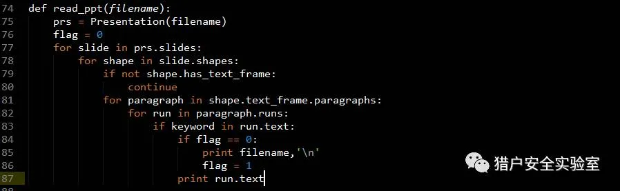 读取ppt用到的库是python-pptx,这个比较简单,ppt读出来的数据都是str类型了,直接和keyword比较就好了。源码如下: