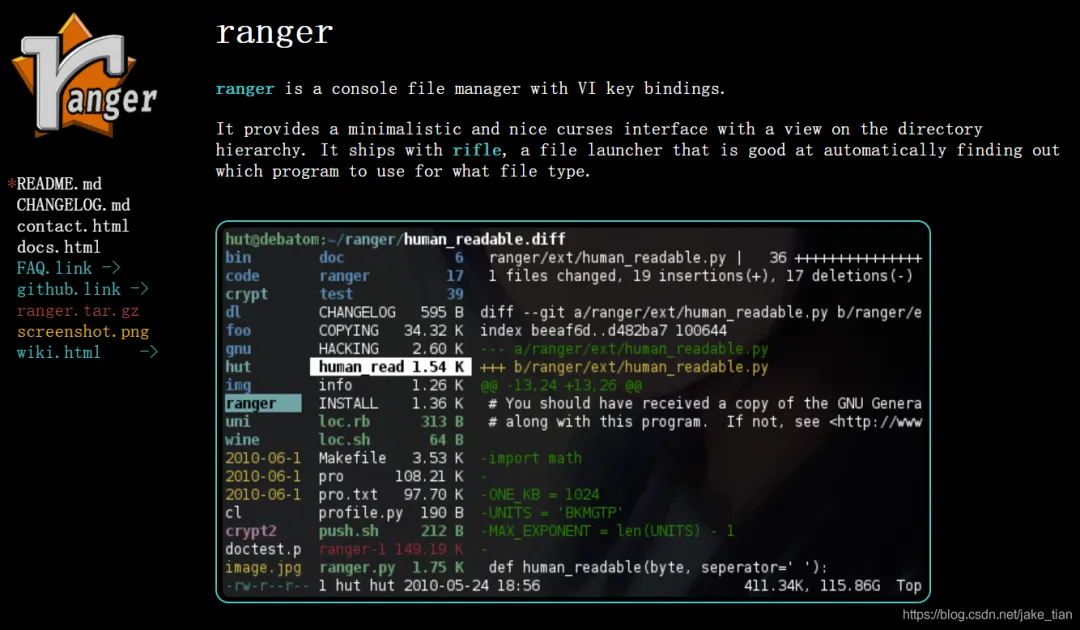 Ranger 具有 VI 键绑定的控制台文件管理器,提供了简约而美观的 curses 界面,具有目录层次结构的视图,带有 rifle 的一个文件启动器,擅长自动找出要用于哪种文件类型的程序。