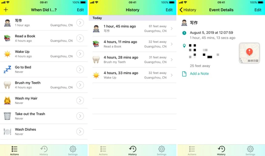 最近我的记性越来越差,前一秒做的事,后一秒就可能会忘记。一天下来,可能都想不起自己今天干了些什么。如果你也有这样的烦恼,When Did I…? 或许能成为你的好帮手。应用的操作十分简单。在「Action」页面,你可以纵览所有已添加的动作,并对其进行排序或增删。轻按某一动作即可标注为「已做」。应用提供了不少动作预设,你可以随时在设置中添加,或创建自己的动作。除了能够帮你记录「做了什么」,When Did I…? 还可以告诉你这件事情「在哪做」、「何时做」。在你点击一个动作后,应用会自动生成一个包含事件、位置信息的事件以供回顾。此外,你还可以为每一个事件添加备注,记录下自己对这件事的感受。这样一来,在我们回顾每一天的时候,就能更加清晰地知道自己何时何地做了什么,感受如何。我们一天所做的事情,往往都会有一定的私密性,我们当然不希望一个 App 对自己一天的行踪尽在掌握。When Did I…? 采用 iCloud 进行数据的云同步,并且开发者在隐私政策中承诺应用不会将任何数据传输给开发者或第三方。如果你是一个对隐私极度敏感的人,甚至可以禁用掉 When Did…? 的网络权限,这并不会影响正常使用。你可以在 App Store 购买 When Did I…?,售价 18 元。