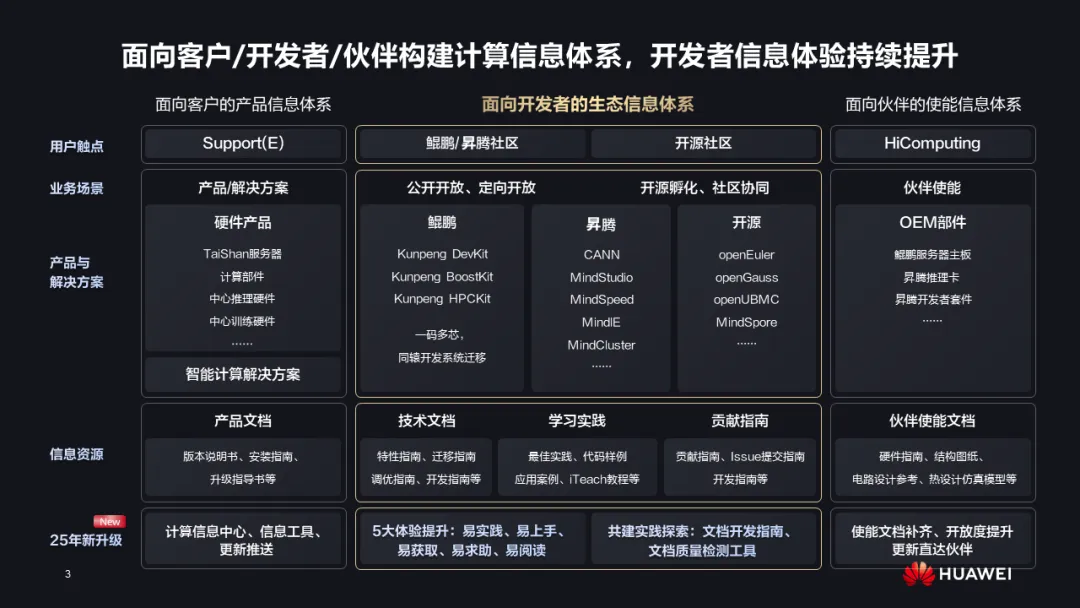 华为计算产品面向不同用户角色提供了差异化的信息体系,主要有三类,第一类是面向客户的产品信息体系,主要围绕计算硬件产品、解决方案通过华为技术支持网站提供产品售后资料。第二类是面向开发者的生态信息体系,主要围绕鲲鹏、昇腾开源开放软件产品通过开发者社区提供开发类文档、学习实践资源,以及开发者贡献文档。第三类是面向伙伴的使能信息体系,主要围绕鲲鹏昇腾OEM部件产品提供使能伙伴进行整机二次开发的资料。