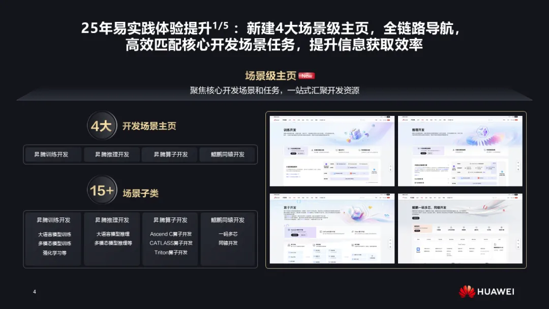 针对开发者最关注的4大开发场景,例如昇腾的训练开发、推理开发、算子开发,鲲鹏的同辕开发场景,我们全新构建了场景化主页,围绕这些核心开发场景的开发任务,汇聚开发过程所需资源,提供全链路导航,让开发者聚焦当下开发任务,快速获取所需资源。