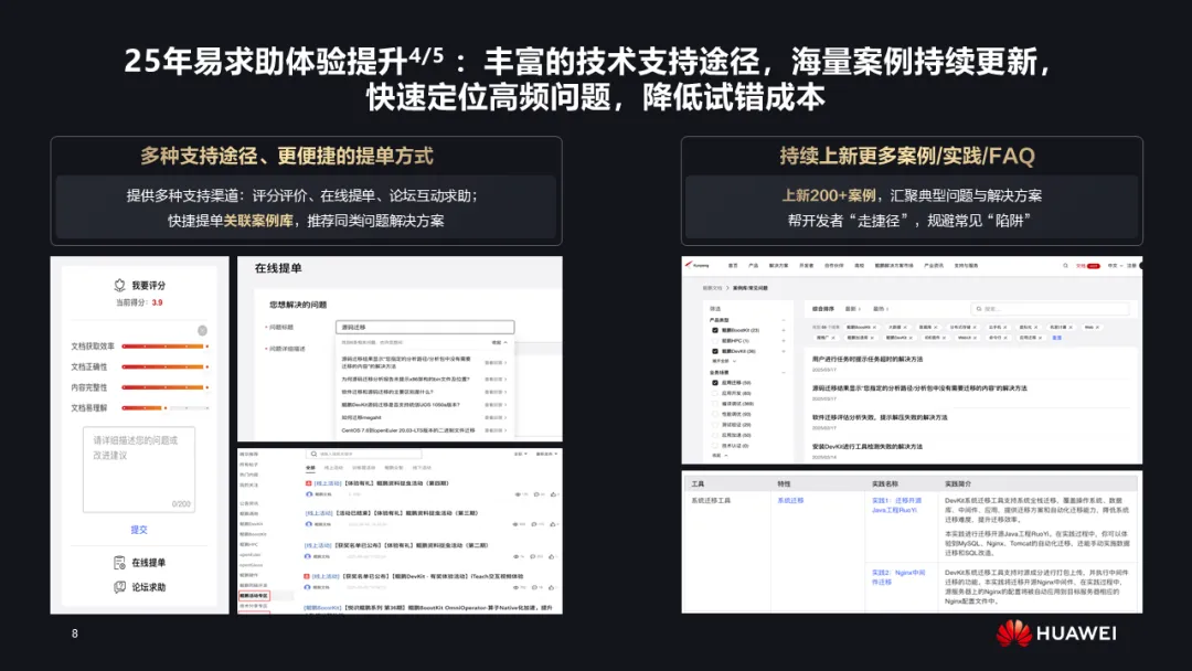 社区提供丰富的技术支持途径,例如阅读文档过程发现文档有问题或者有疑问,可以在线评分反馈或提单,提单时支持关联社区海量案例库资源,类似案例可以作为参考,开发者无需重复提单,节省开发者查找资源的时间。同时我们也会将开发者咨询求助的问题转化为常见问题或故障案例,持续丰富案例资源,帮助开发者快速解决问题,降低试错成本。