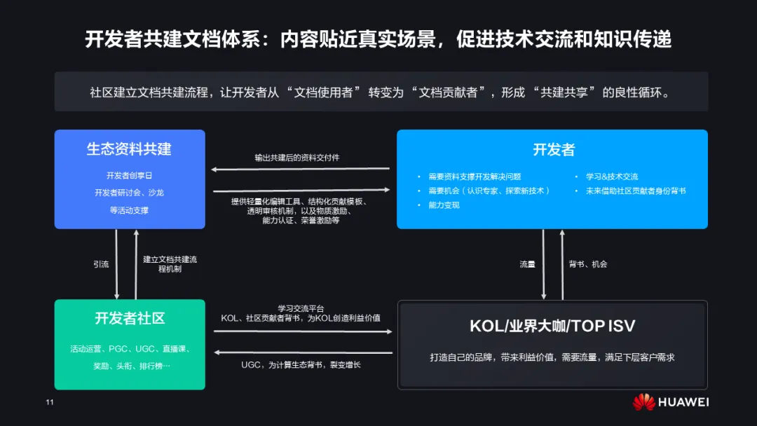 匹配计算鲲鹏昇腾软件开源策略,我们也在探索软件开源后,配套的开源文档如何联合开发者一起参与贡献的机制。让开发者从文档使用者,逐步成为文档贡献者。一方面开发者社区构建文档PGC、UGC机制、平台、工具、流程指导、物质激励、能力认证等资源,借助社区各种运营活动和社区KOL、业界大咖、TOP ISV等的知名度和影响力,希望带动更多开发者参与文档贡献,促进技术交流和知识传递,也让开发者的能力能够变现,最终形成共建共享的良性循环。