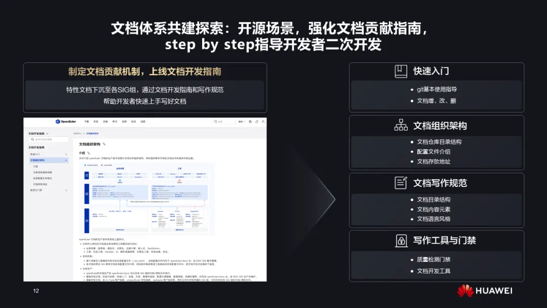 在openEuler开源社区运作过程中,逐步总结了一些文档共建的机制,例如通过将特性文档下沉到各个SIG组,定义统一的文档开发指南和写作规范,包括git基础操作指导、文档目录存放结构设计指导、文档内容增删改操作指导等,step by step指导开发者快速上手进行二次开发。