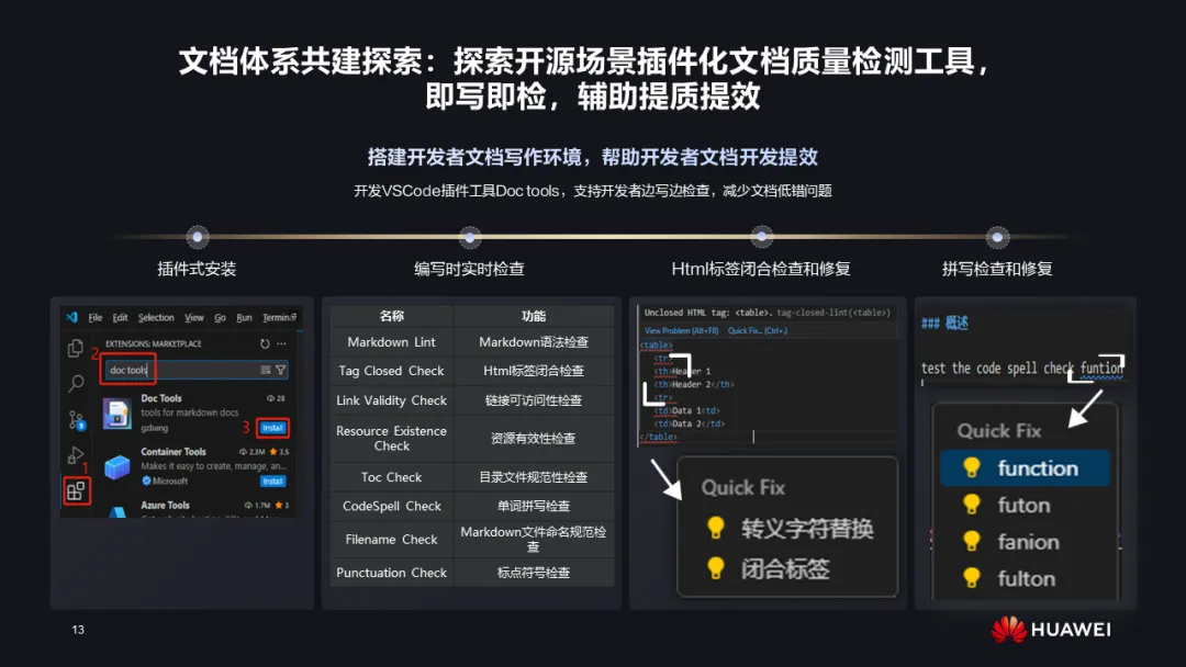 开源文档写作过程中,我们也自研了基于VS Code插件版文档质量检测工具,通过在插件端即可一键安装该工具,开发者使用MarkDown写文档时,能够边写边检查,例如错别字、拼写错误、MarkDown语法、html标签闭合等基础质量检测,同时针对检测出来的错误提供快速修复能力,辅助开发者提质提效。
